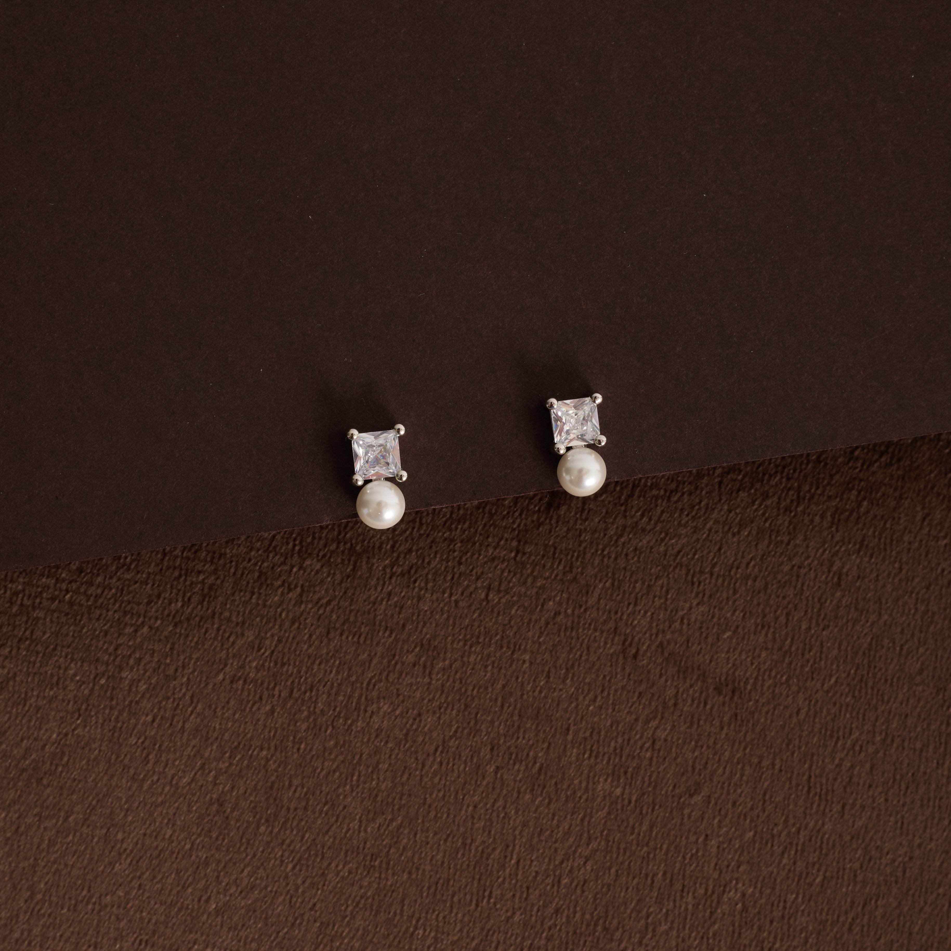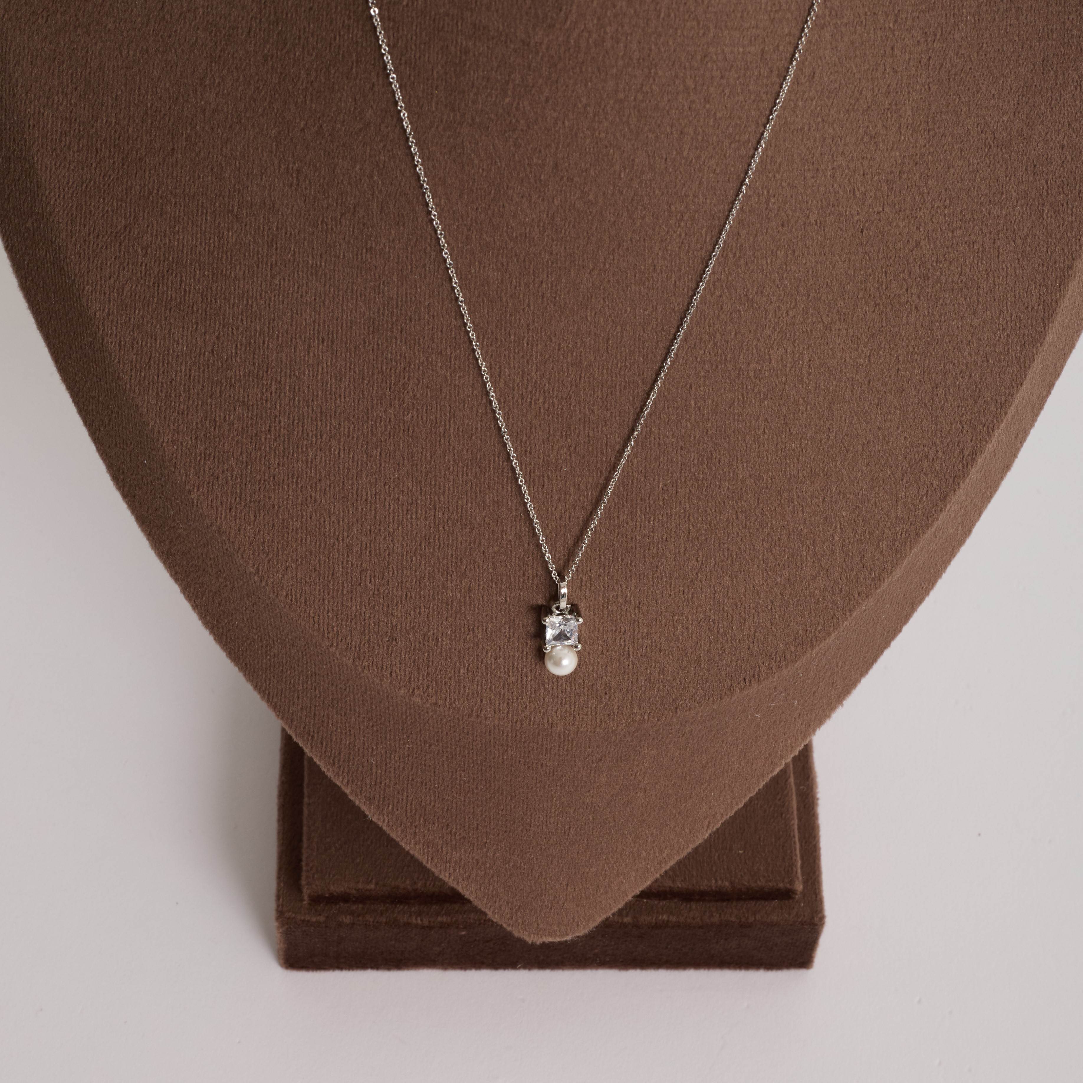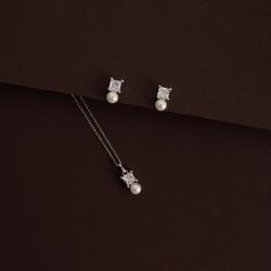 Conjunto brinco e colar zircônia quadrada e pérola 11mm corrente cadeado 45cm com alongadora | asth