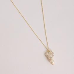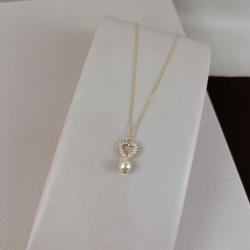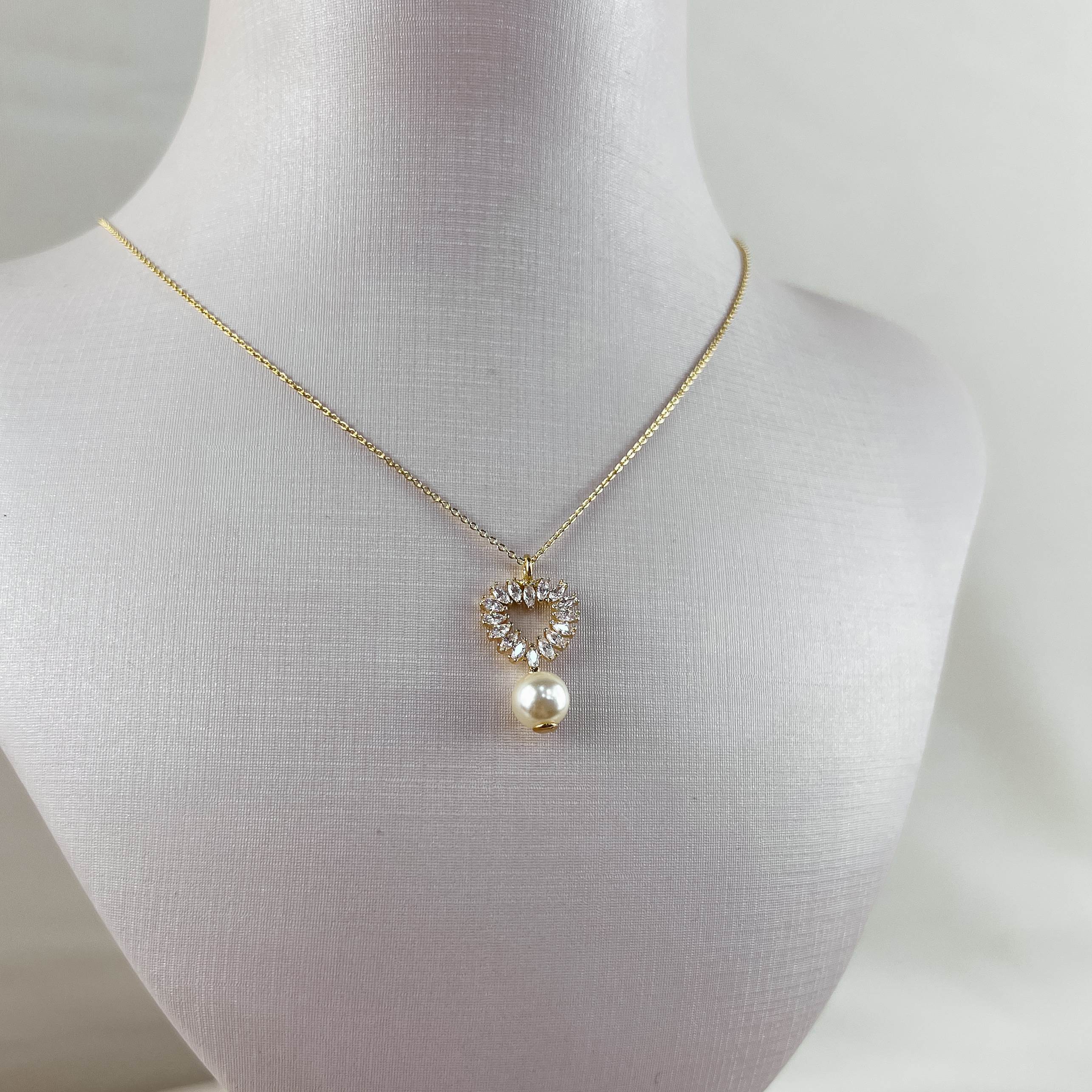 Colar pingente coração vazado cravejado e pérola 19mm 45cm com alongadora