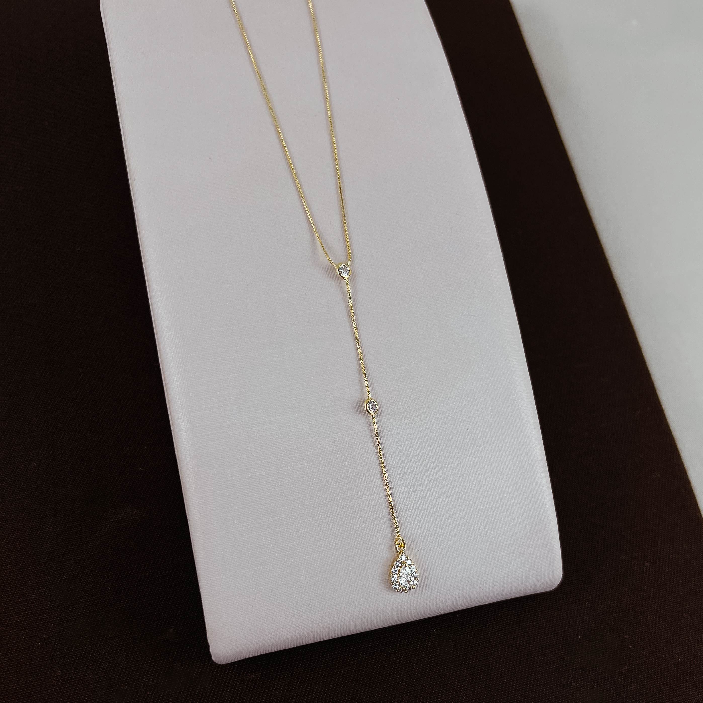 Colar gravatinha zircônias redonda e gota com cravejado 9mm 50cm com alongadora