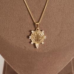 Colar pingente medalha São Bento com zircônias 22mm 45cm com alongadora | asth