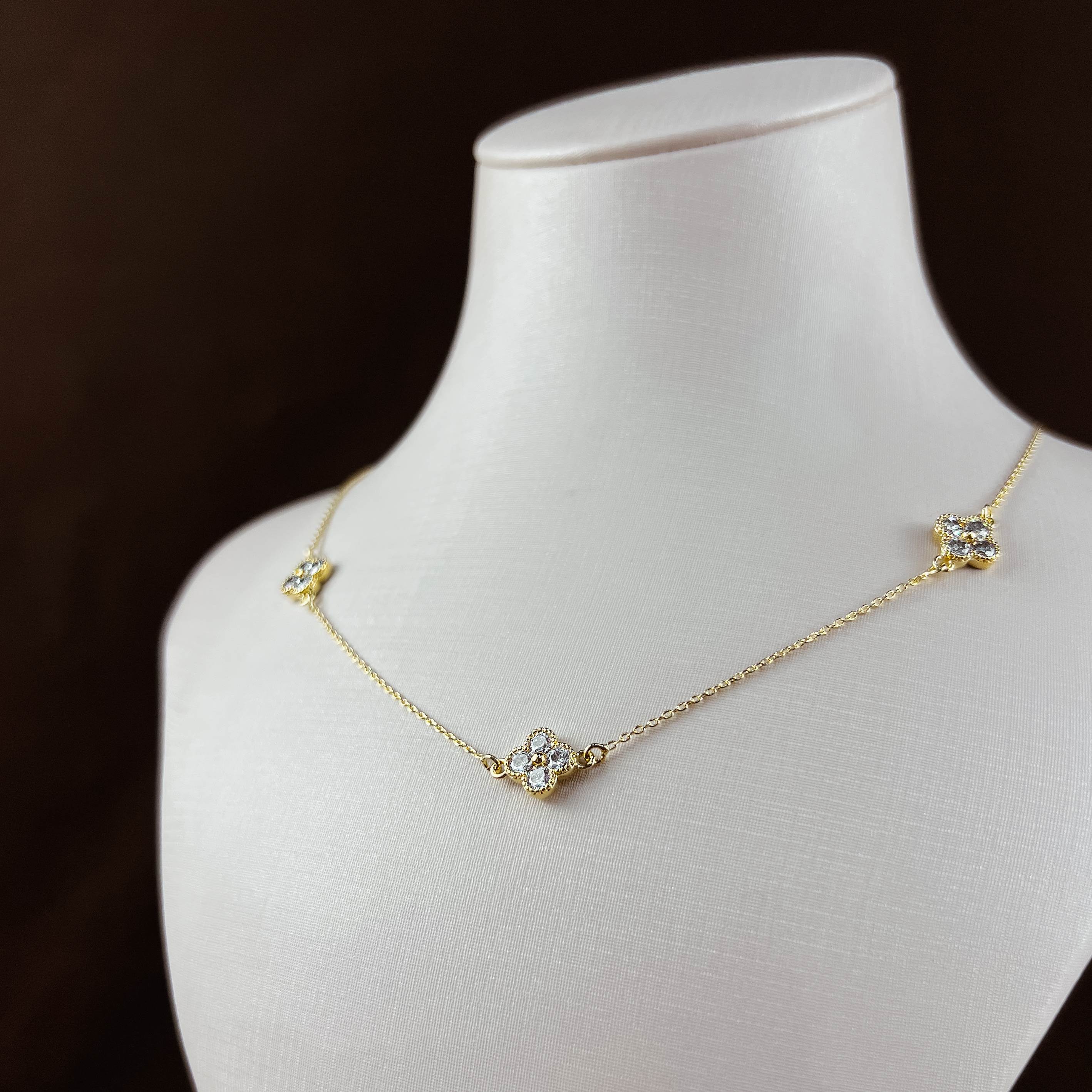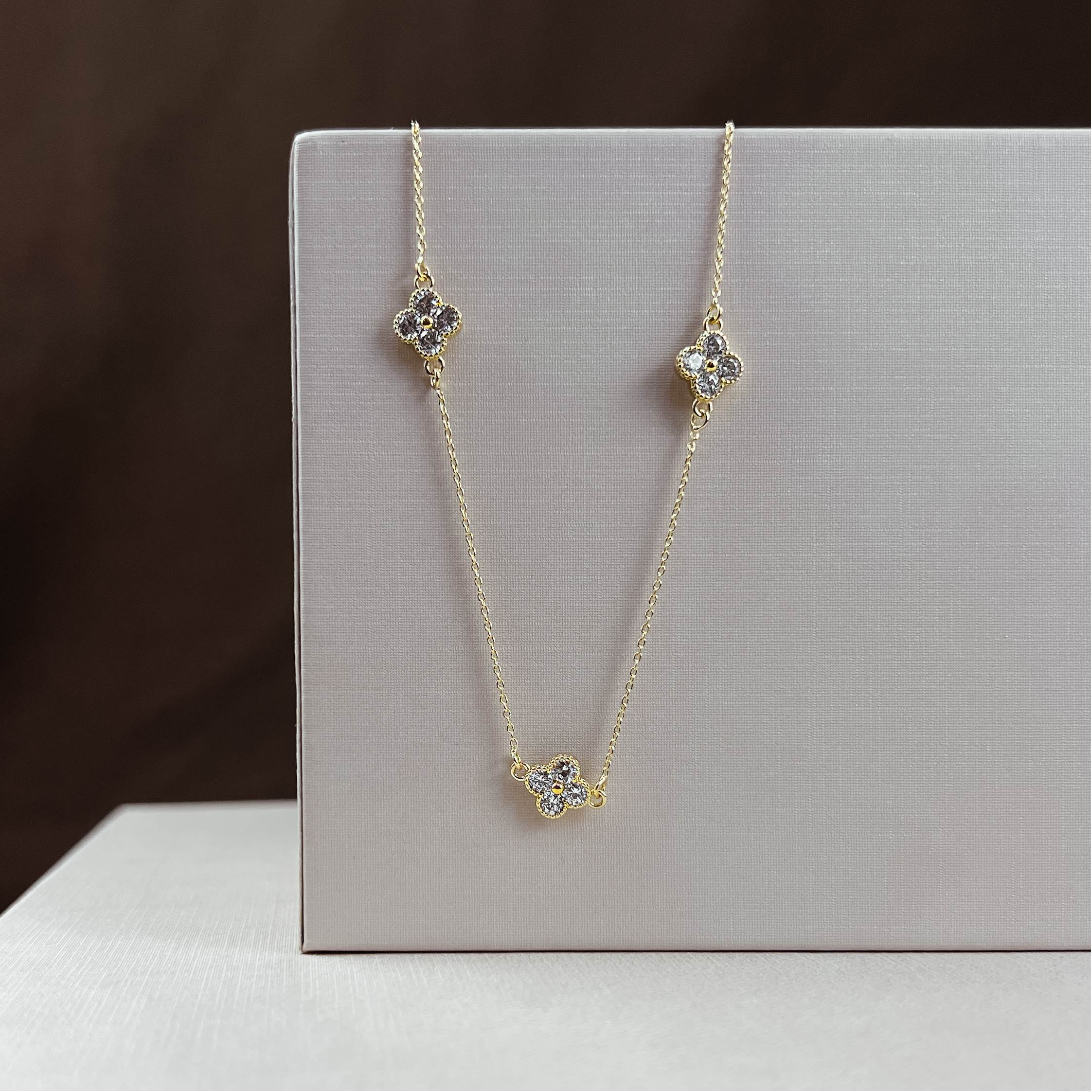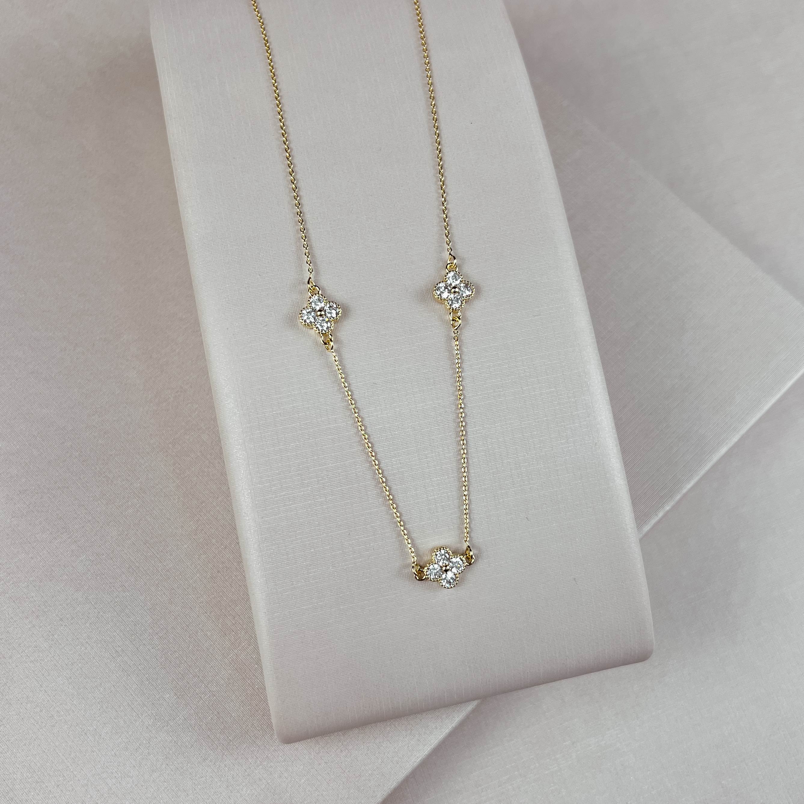 Colar entremeio trevos cravejados 8mm corrente cadeado 45cm com alongadora