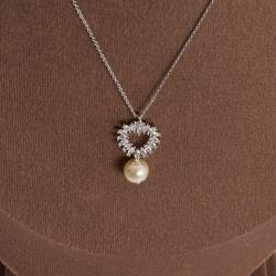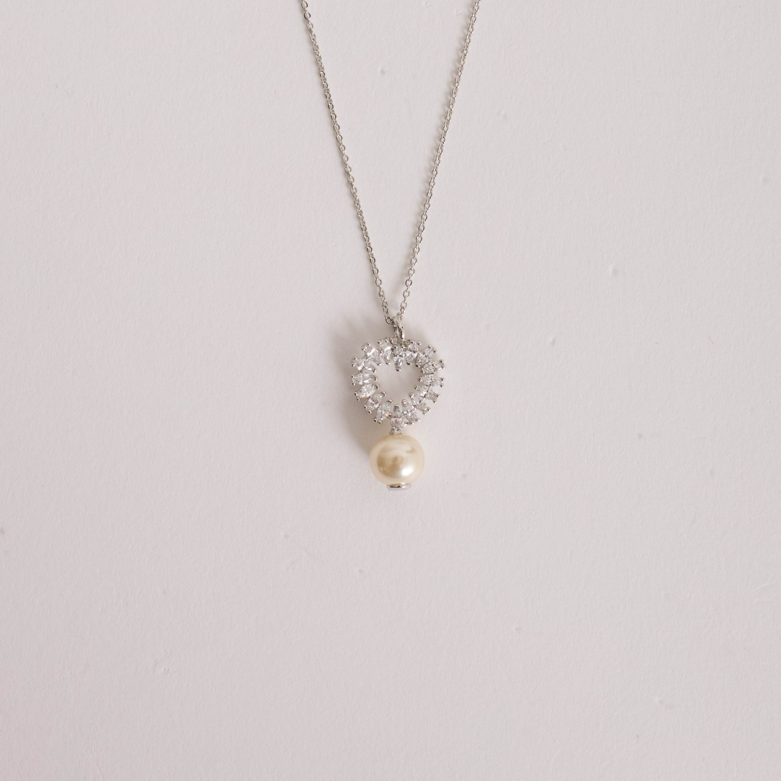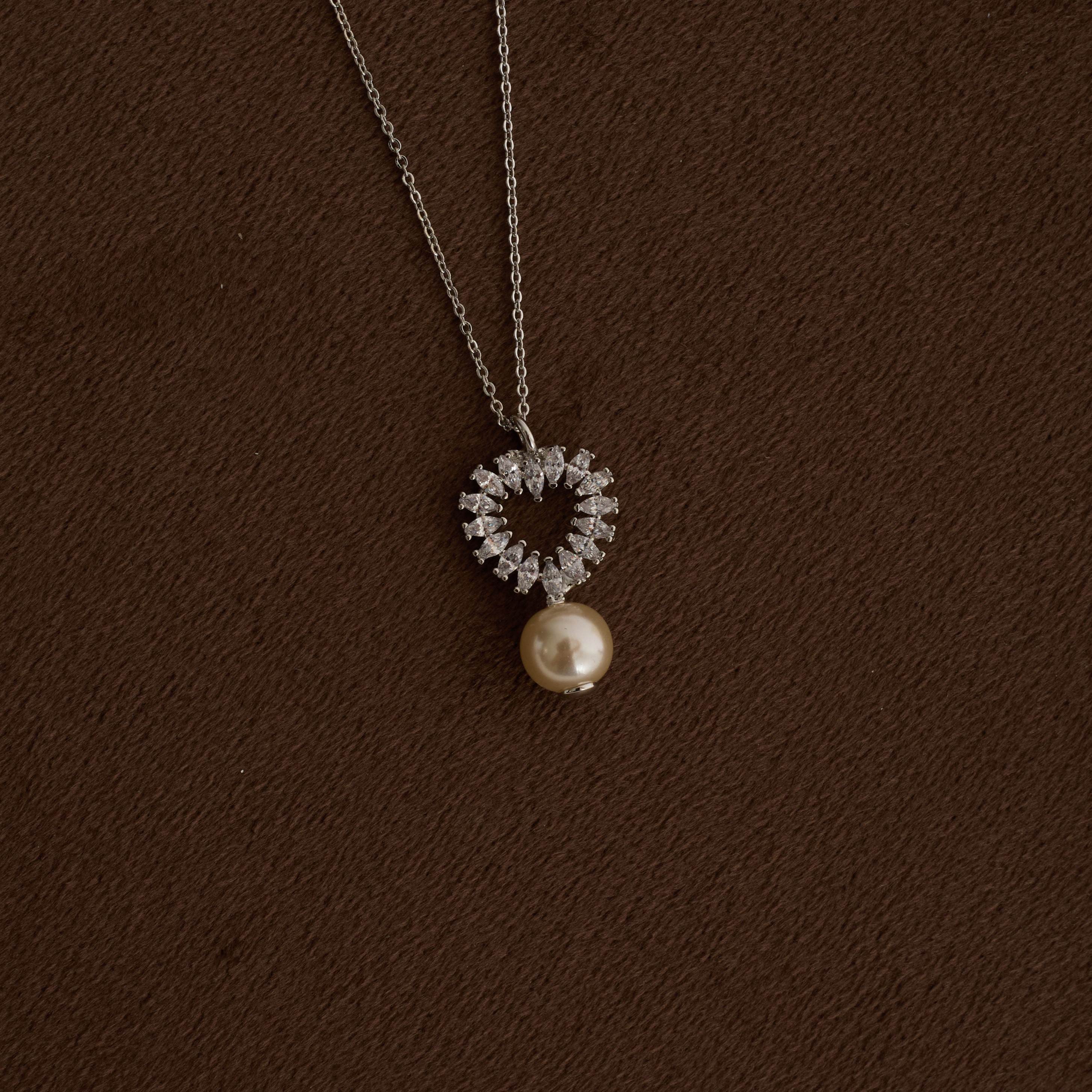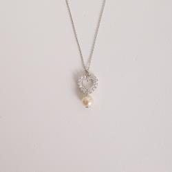 Colar pingente coração vazado cravejado e pérola 19mm 45cm com alongadora